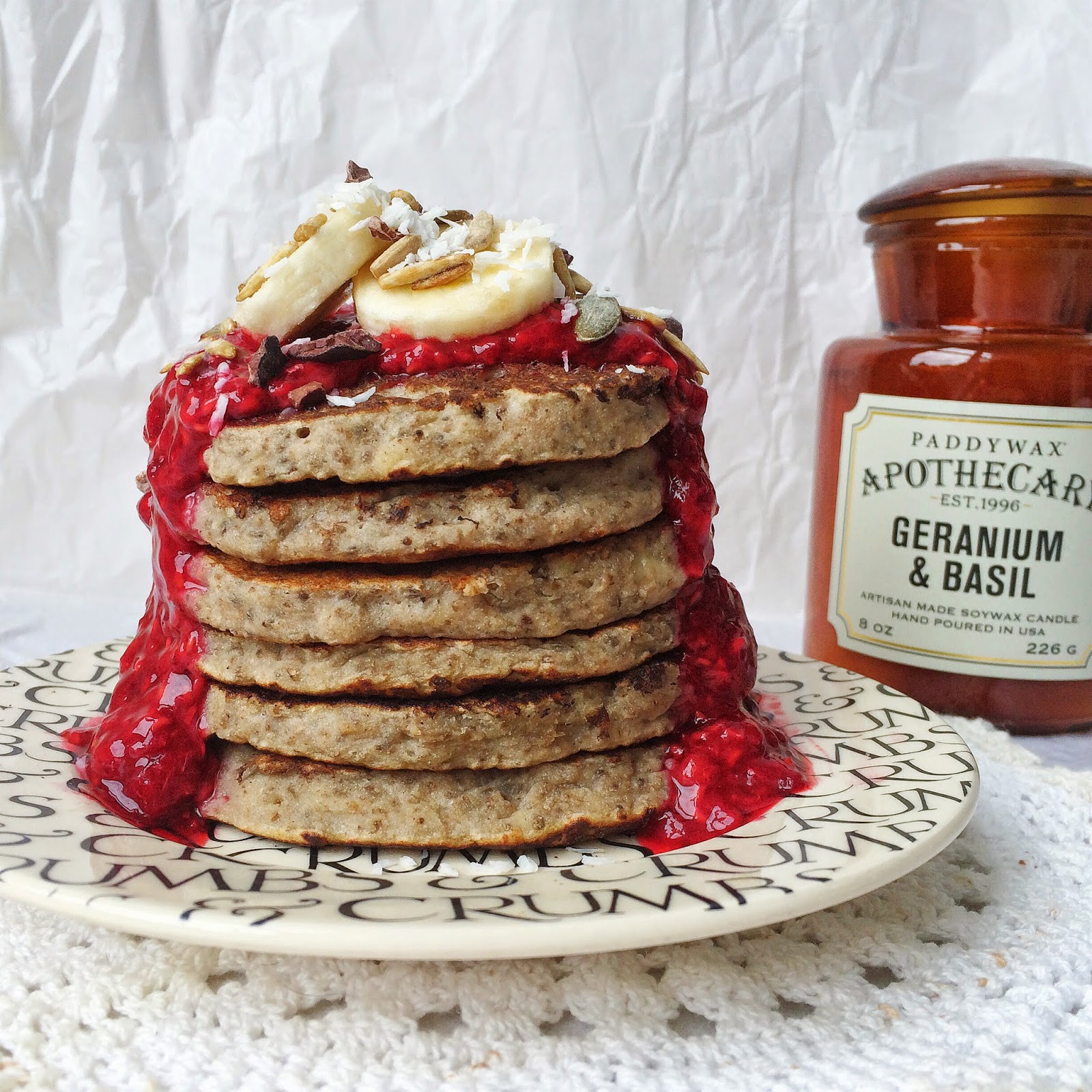 Basic vegan buckwheat pancakes topped with banana coins, raspberry compote, dessicated coconut and a sprinkle of Punch Foods' Meet Your Maca superseeds