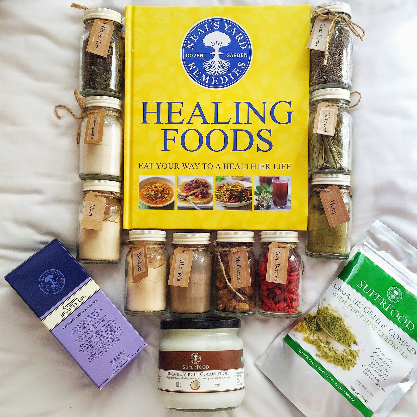 About a month ago I received one of the most incredible parcels I've ever had the pleasure of opening from the wonderful Neal's Yard Remedies, a natural health and beauty company based in the UK; they very kindly sent me a selection of some of their popular health food products including a variety of adorable jars containing various superfoods, a copy of their 'Healing Foods' information and recipe book, a jar of organic virgin coconut oil, their organic beauty oil and a pack of their new Organic Greens Complex powder. They all arrived in an amazing wicker hamper and, needless to say, I was extremely excited when I opened it!